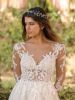 Perfetto modello da sposa a trapezio con spacco alto sulla gamba, con scollatura davanti illusione, maniche lunghe e schiena in pizzo effetto tattoo di assoluta tendenza. Un look etereo e couture.