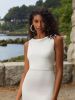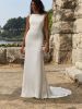 Questo sofisticato abito da sposa in raso di seta, dalla vestibilità aderente, presenta un elegante scollo a barca, una sensuale schiena scoperta e un cinturino con motivo floreale 3D