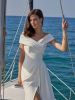 Meraviglioso abito da sposa in crêpe elasticizzato con corpetto delicatamente drappeggiato, maniche scese, discreta scollatura a punta. La gonna è impreziosita da un sensuale e profondo spacco, completano il look una delicata fila di bottoncini.