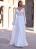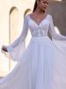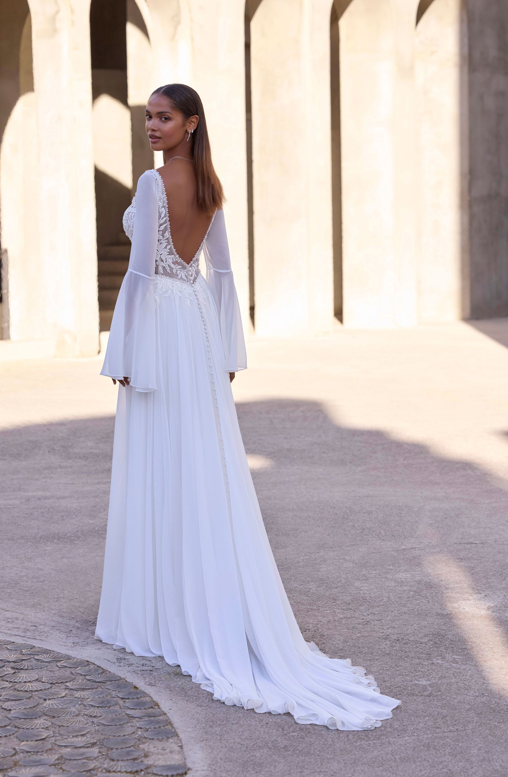 Questo raffinatissimo modello di abito da sposa in chiffon a trapezio è caratterizzato da un corpetto trasparente con scollo a V, applicazioni di paillettes e perline, schiena bassa e maniche a campana staccabili.