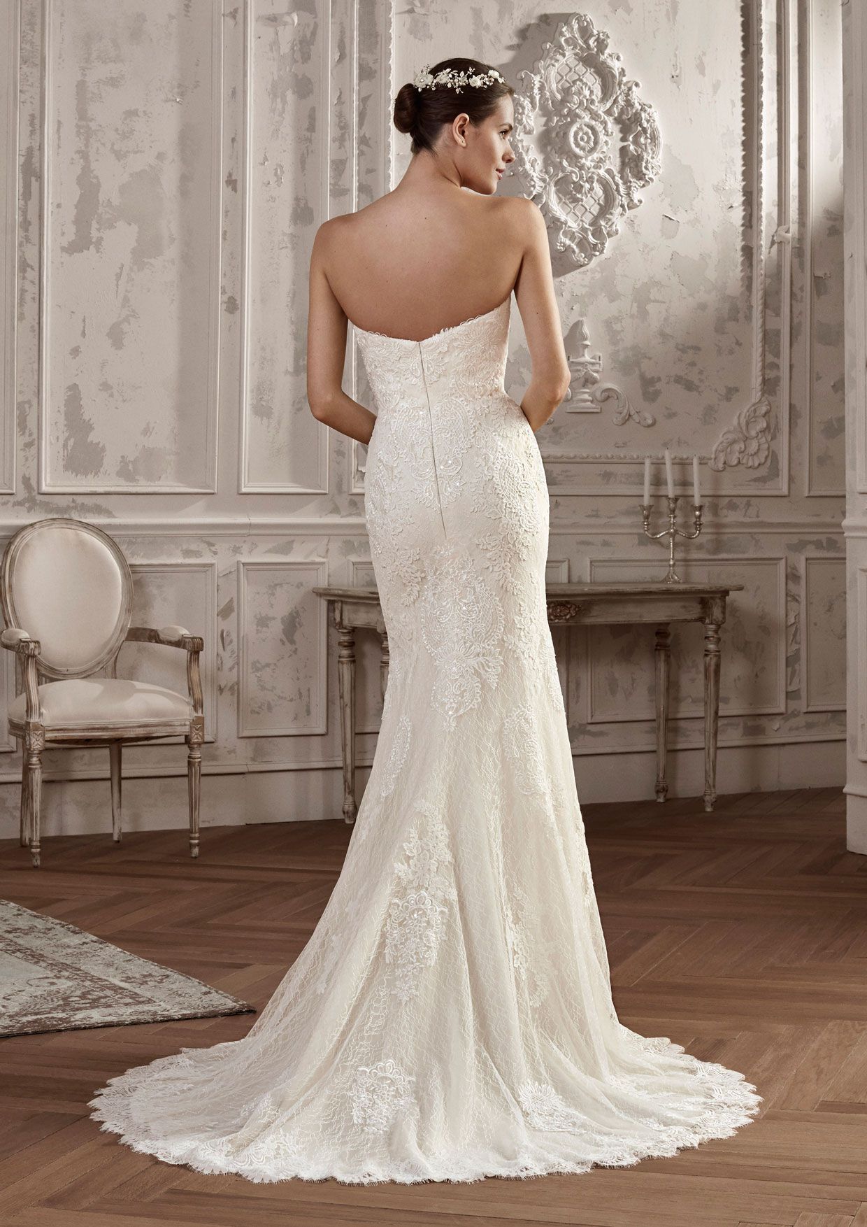 La femminilità diventa abito in questo sensuale modello di abito da sposa a sirena in tulle e pizzo con particolari di strass e una seducente scollatura a cuore.