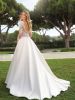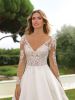 Questo elegante e romantico abito da sposa dalla “silhouette”a trapezio, realizzato in raso Larissa, presenta una profonda scollatura a “V” sul davanti e una delicata scollatura tondeggiante sulla schiena. Eleganti maniche lunghe in pizzo trasparente completano il look.