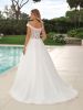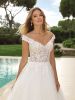 In perfetto stile principessa questo abito da sposa in tulle preziosamente ricamato con maniche scese che incrociano sensualmente le spalle, corpetto in pizzo e una morbida gonna in tulle che termina in un ampio strascico a cappella sapientemente ricamato con applicazioni di pizzo.