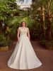Magnifico abito da sposa stile principessa con dettagli moderni dallo stile unico. La gonna in Mikado off-white a strati di grandi dimensioni si apre in uno strascico a cattedrale. Il corpetto è caratterizzato da collo alto, maniche ad aletta in pizzo. La vita è sottolineata da una fascia pieghettata, rifinita con un fiore 3D glitterato.