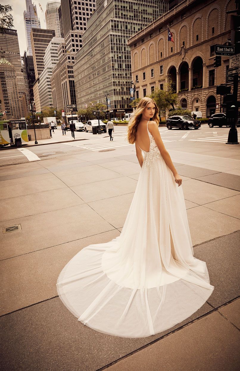 Abito da sposa a trapezio in scintillante tulle glitterato con spettacolari dettagli in pizzo con paillettes. Il corpetto a ballerina è sostenuto da stecche interne e coppe per una vestibilità impeccabile, la schiena è caratterizza da una profonda scollatura.