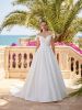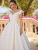 Un romantico abito da sposa da favola con delicati fiocchetti che incorniciano le spalle scoperte. Caratterizzato da una moderna schiena trasparente con bottoni rivestiti in tessuto, questo intramontabile abito in mikado è perfetto per una sposa tradizionale.