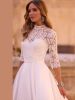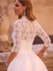 Questo abito principessa con maniche a tre quarti e scollo a cigno unisce struttura e romanticismo. Il corpetto semitrasparente in pizzo si fonde con una gonna voluminosa in morbido raso, creando una silhouette maestosa con dettagli che brillano delicatamente grazie alle delicatissime perline.