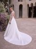 Questo abito da sposa a trapezio presenta un corpetto trasparente con applicazioni in pizzo floreale, maniche lunghe trasparenti e una scollatura a cuore su una gonna in raso.
