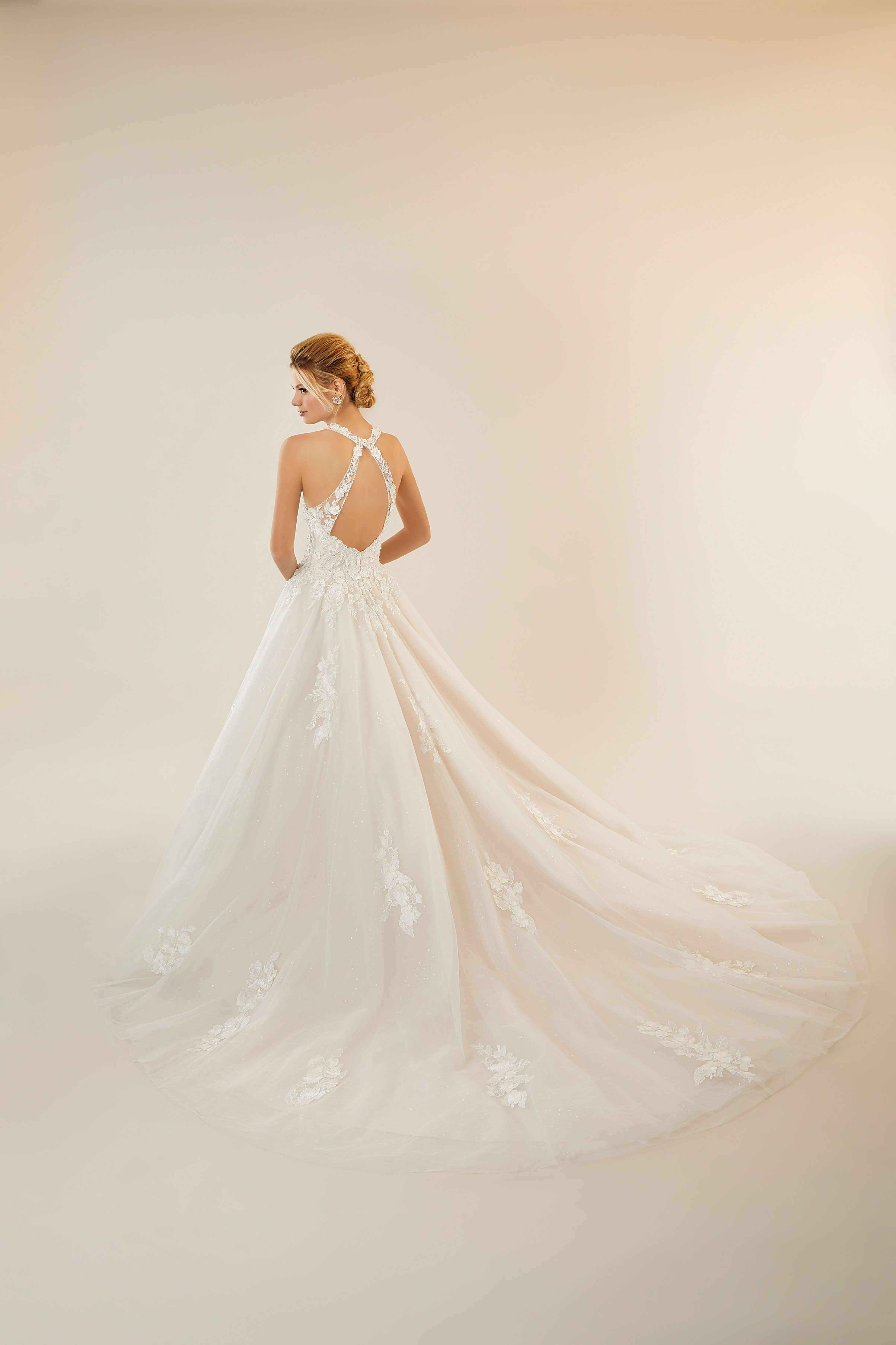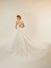 Cristalli abbaglianti e ricami di perline accentuano magnificamente il corpetto a V profonda sul nostro abito da sposa. Caratterizzato da delicate spalline e pizzo chantilly. La gonna in tulle e organza glitterata crea uno straordinario effetto scintillante.