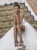 Questo modello di abito da sposa gioca sull'effetto sorpresa, adatto per la sposa che non vuole rinunciare al vestito tradizionale dalla romantica gonna lunga in tulle con strascico che nasconde un' intrigante body-tutina in pizzo con shorts. Il corpetto con delicata scollatura rotonda presenta ricami floreali in pizzo supertrendy.
