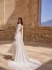 Raffinato abito da sposa in stile boho, in morbidissimo chiffon con maniche a mantella e dettagli in pizzo. Il corpetto è caratterizzato dall’elegante scollatura quadrata decorata con perline. Il punto vita è definito da un bordo in pizzo sapientemente ricamato.