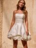 L’abito che non ti aspetti, un tocco magico e sorprendente per l’outfit di questo abito da sposa. Ѐ strabiliante la grande trasformazione che si riesce ad ottenere grazie alla sovragonna a palloncino in mikado che regala la possibilità di avere due abiti in uno, giocando con i volumi del modello corto con fiori effetto 3D della parte inferiore.