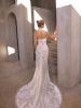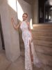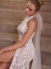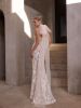 Pensato per farsi notare, questo abito a sirena combina un collo all’americana con una schiena scoperta che aggiunge freschezza e sensualità. Le applicazioni floreali in pizzo su tulle creano una texture ricca e avvolgente, perfetta per una celebrazione elegante e moderna. Completano il look un profondo spacco e maniche in pizzo staccabili.